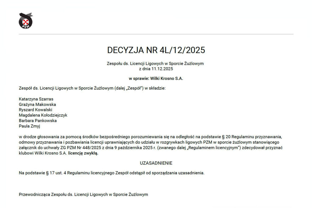 Cellfast Wilki Krosno otrzymały licencję zwykłą na sezon 2026, co oznacza pozytywne zakończenie całego procesu licencyjnego i spełnienie wszystkich wymaganych kryteriów formalnych, organizacyjnych oraz infrastrukturalnych. Decyzję w tej sprawie podjął w czwartek 11 grudnia Zespół ds. Licencji Ligowych w Sporcie Żużlowym.